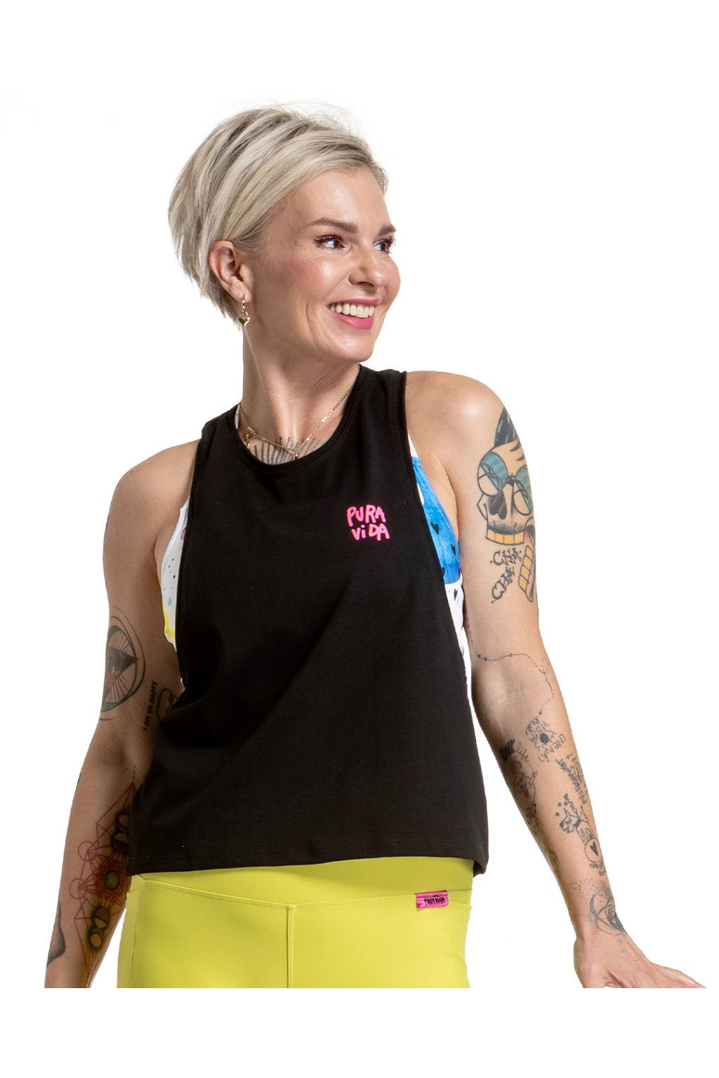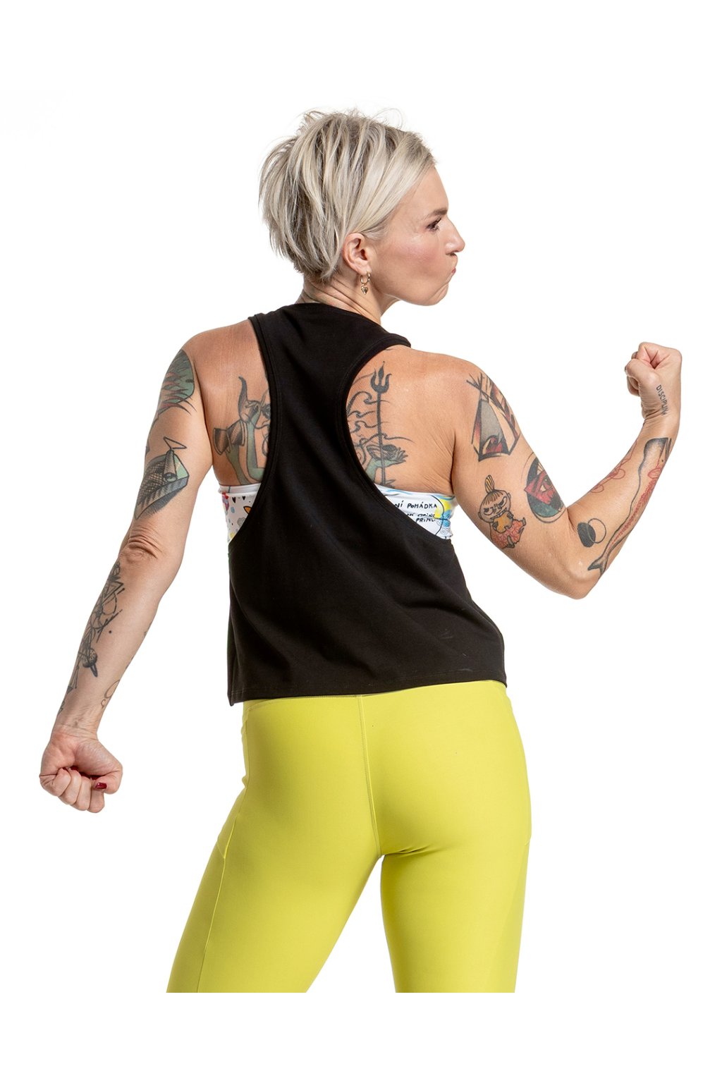 Pružné tílko na fitness šijeme z bavlny (97 %) a elastanu (3 %). Tenhle materiál už znáš z trička VLEČKA, tílko má i stejný výstřih, protože z VLEČKY vychází. Bude se ti v něm parádně posilovat, ale třeba taková Petruccya v něm v létě i běhá – baví ji, že vykrojenými zády krásně kouká podprda, ale pupík zůstává schovaný. A navíc pod tričko při běhu příjemně fouká!