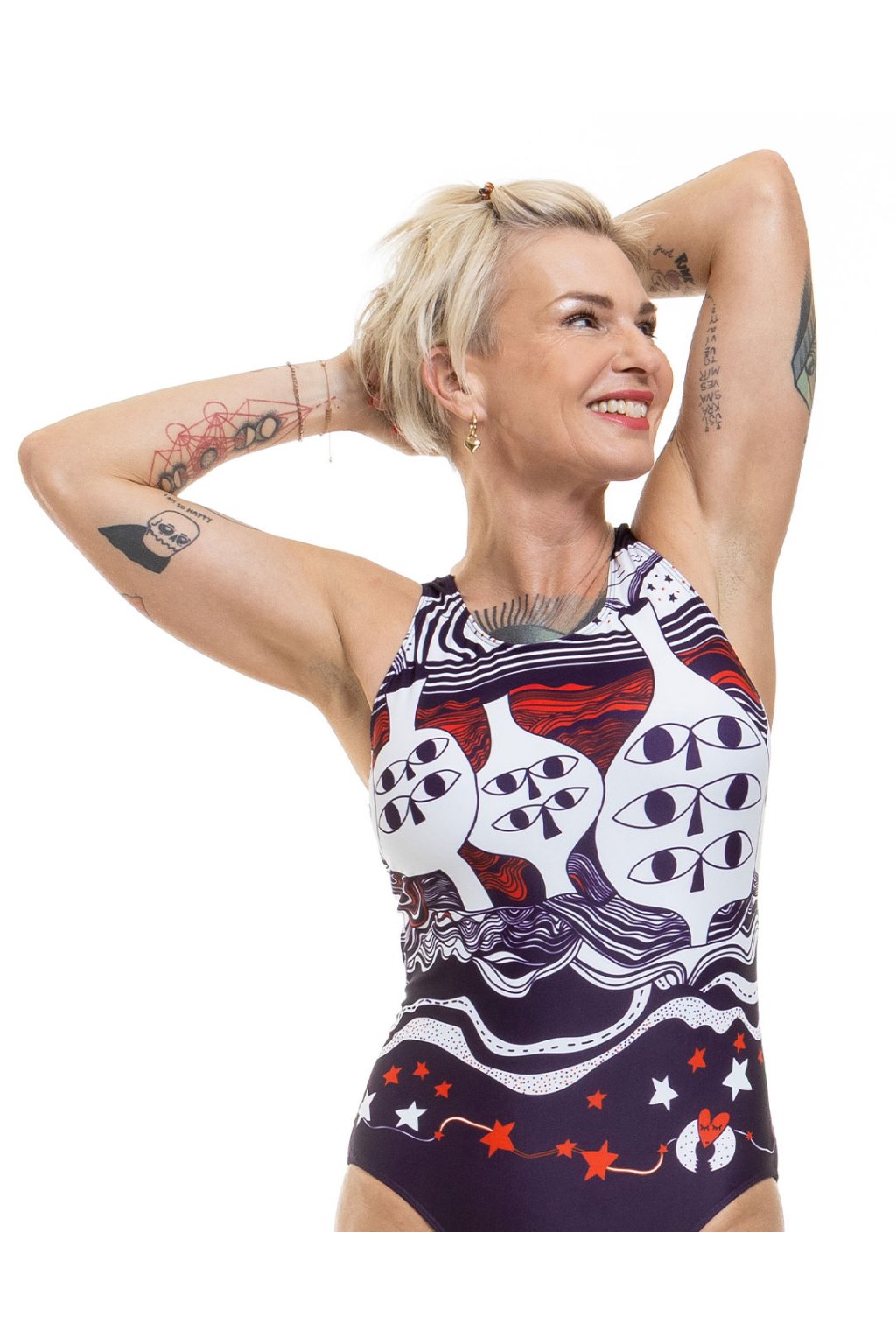 Designové dámské plavky s křížovými zády šijeme z příjemného elastického úpletu (elastan 20 %, polyester 80 %) a přední díl podšíváme lehoučkou dresovinou, aby plavky zakrývaly všechno, co zakrývat mají. Nemají kostice, háčky, výztuhy ani kapsičky na vycpávky a ramínka nejsou nastavitelná.