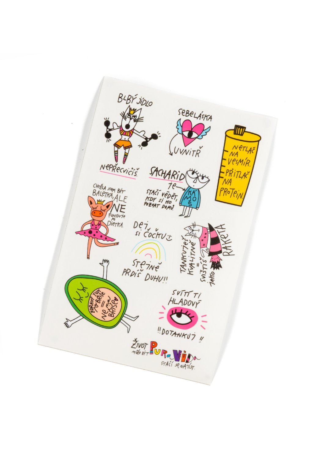 Samolepky vyrábíme z kvalitní fólie s lesklým povrchem, díky tomu nejen skvěle drží a vzdorují oděru, ale vydrží i jemné omývání. Samolepkový arch BLBÝ JÍDLO NEPŘECVIČÍŠ je autorským počinem brněnské umělkyně Petruccyi, zakladatelky Pura Vidy.