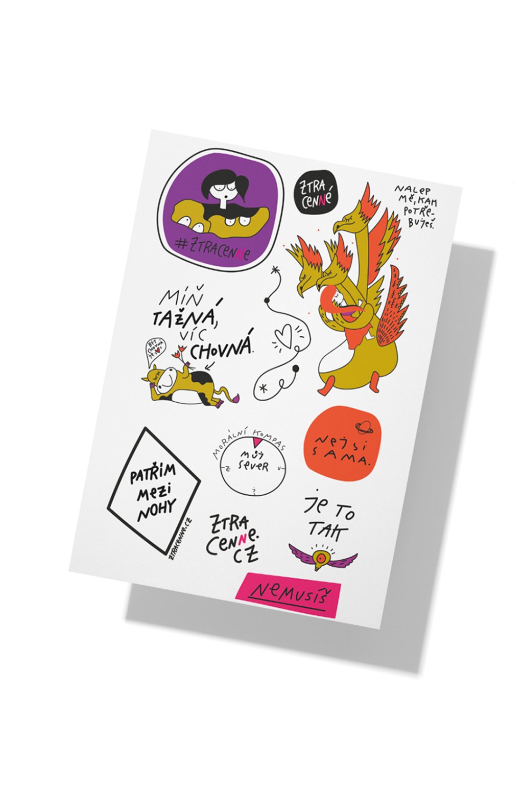 Samolepky jsou z kvalitního lesklého materiálu, dobře drží, těžko se odřou a jdou omývat. Lehce samozřejmě, do vody bychom je nebraly. Vytvořila je brněnská umělkyně Petruccya, ilustrátorka a spoluautorka Ztracenných.